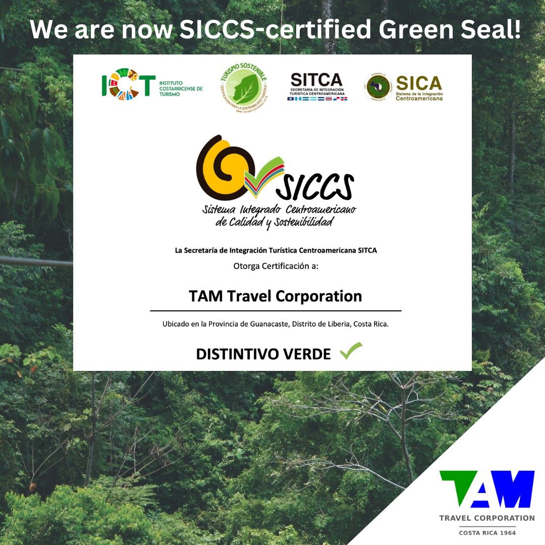 TAM has officially received the Central American Integrated System for Quality and Sustainable Tourism (SICCS) Green Seal —the highest level of sustainability certification awarded in the region, granted by the Costa Rican Tourism Board (ICT). This distinguished recognition places us among the top regional leaders in responsible travel and destination services in Costa Rica, certifying that our operations meet—and exceed—the most rigorous sustainability standards in Central America.