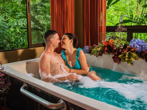 Enjoy a private bath in our decorated Jacuzzis with flowers and exotic plants from the beautiful garden accompanied by an exquisite glass or wine.